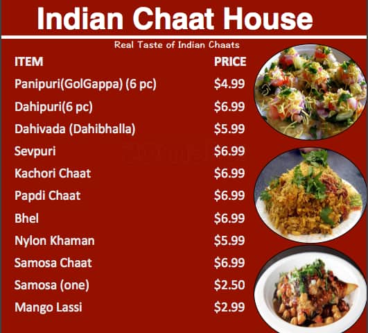 Chaat house menu card. Hours Monday - Sunday 1030AM - 1000PM. 78 reviews Open Now. Two vegetables Dal Raita Kadhi rice papad with 2 rotis and choice of Soda or Chass or Tea.